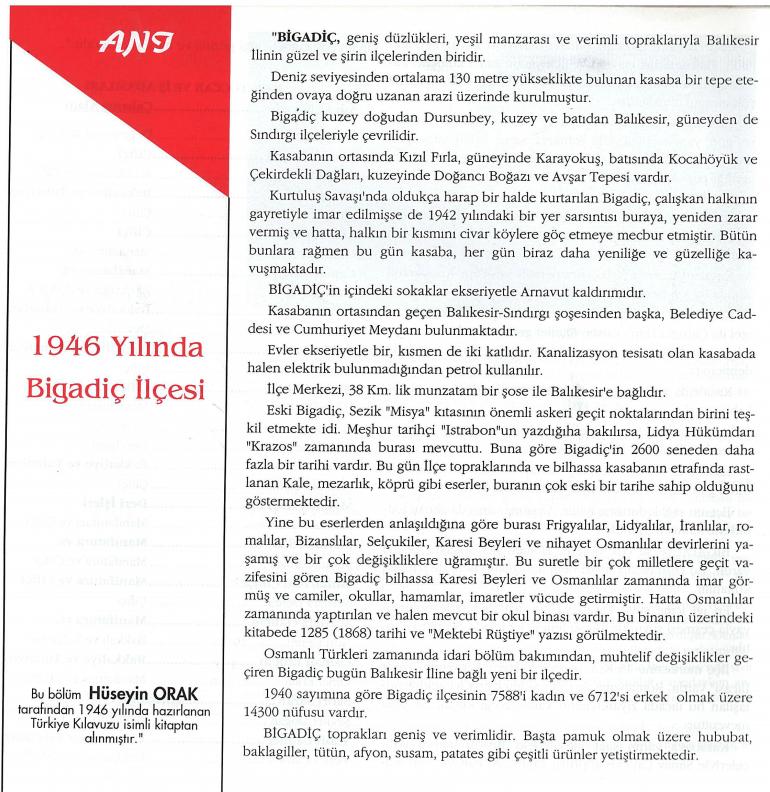 1946'da Bigadiç / Bigadiç / Bilgi Peşinde / www.bilgipesinde.com / Bu yazı 1996 yılında yayınlanan Bigadiç dergisinden alınmıştır. 1946 yılında Bigadiç'in durumu ve özelliklerini anlatan bir yazıdır.