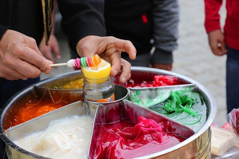 Allı Dayı'nın "Erbab işii, Bunu yapan iki kişi, Biri erkek biri dişii.." diyerek sattığı mis kokulu kokareç bayram süresince yoktu artık. Topal Ömer'in dondurması, Balıkesirli Adam'ın sırtında taşıdığı semaver gibi nesneden bardaklara doldurduğu şerbet, Kızılçukur'dan kıl torbalarla gelip testereyle kesilerek satılan kar, Bılliş Ramazanın tahta tablasında peynir kalıbı gibi duran cevizli taş helva bayram paralarımızı tükettiğimiz şeylerdi. Ortadan kesilmiş portakala benzer göz göz bir teneke tablada yedi değişik renkte macun, satıcının kolunda gezdirdiği camekan kabında kıpkırmızı elma şekerleri, ayak pedalıyla döndürülerek camlara savrula savrula biriken pamuk helva.. Cebimizde kırık leblebiler, susamlı şekerler, akide şekerleri ile bayram boyunca mide fesadından iç bulantısı yaşardık.