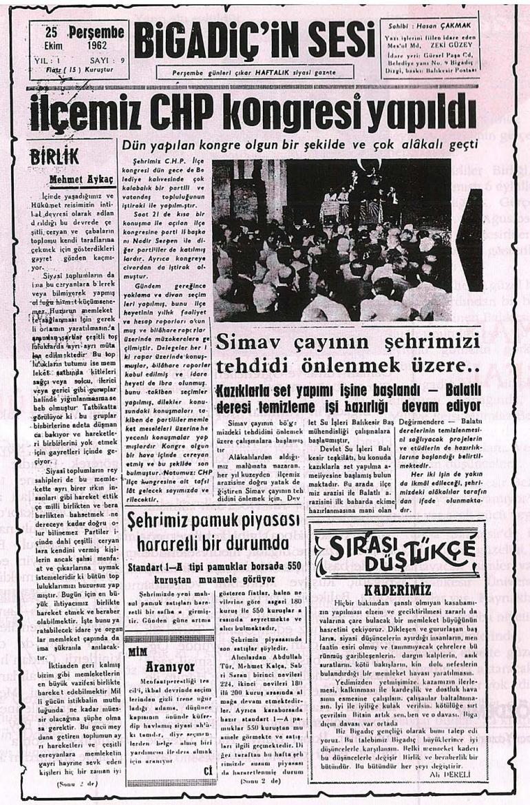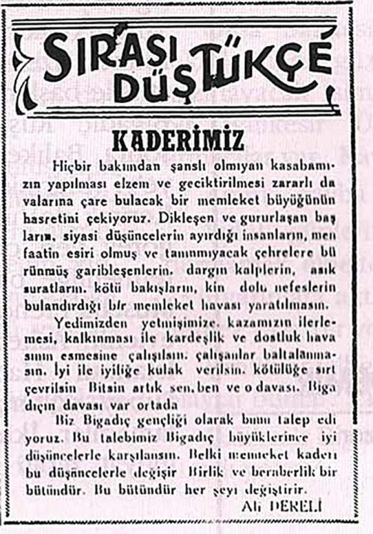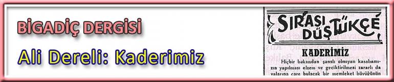 Kaderimiz / Ali Dereli / Bigadiç Dergisi / Bigadiç'in Sesi Gazetesi / Bilgi Peşinde / .... İyi ile iyiliğe kulak verilsin, kötülüğe sırt çevrilsin. Bitsin artık; sen, ben ve o davası. Bigadiç'in davası var ortada. Biz Bigadiç gençliği olarak bunu talep ediyoruz (istiyoruz) Bu talebimiz Bigadiç büyüklerince iyi düşüncelerle karşılansın. Belki memleket kaderi bu düşüncelerle değişir.